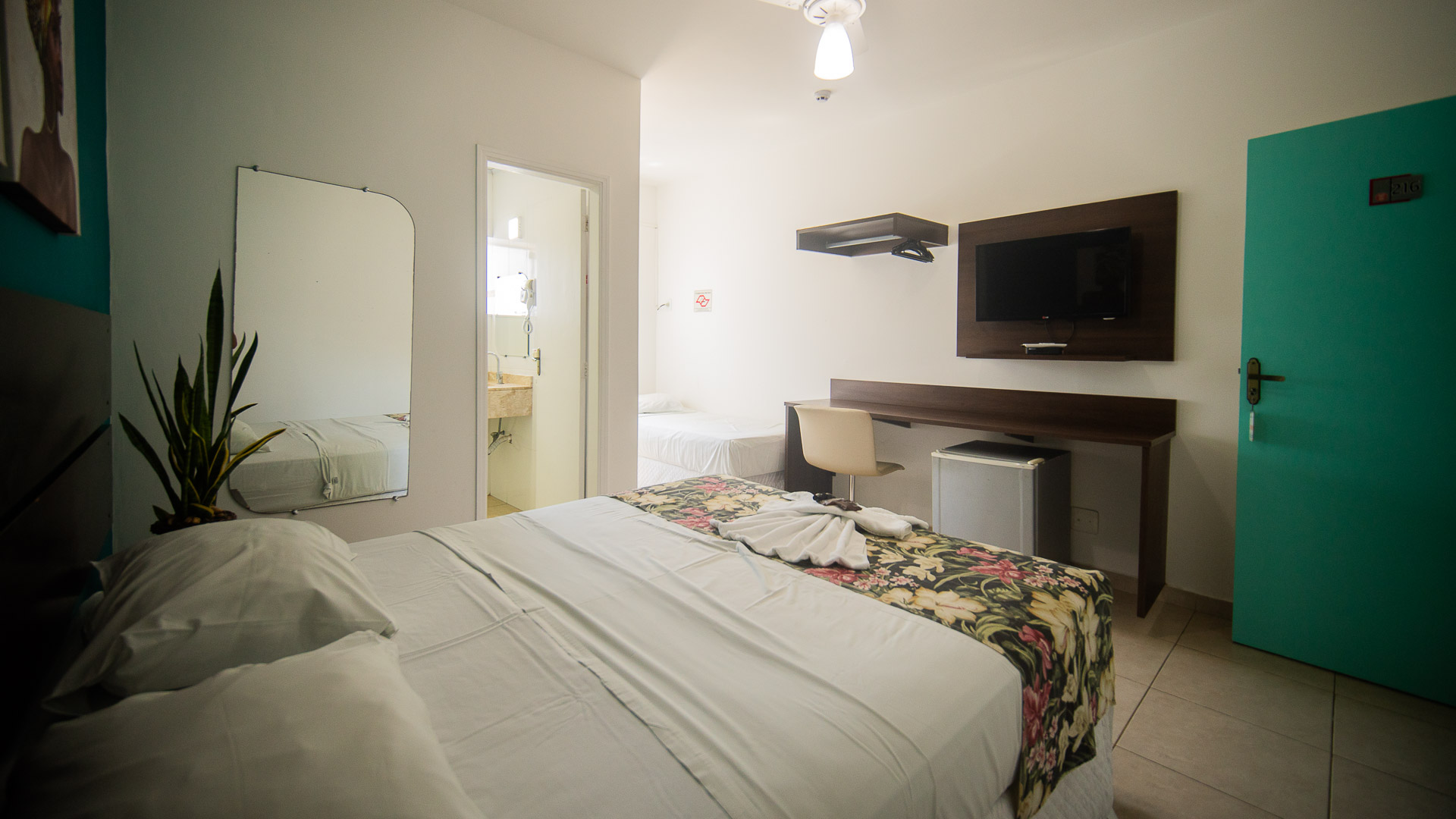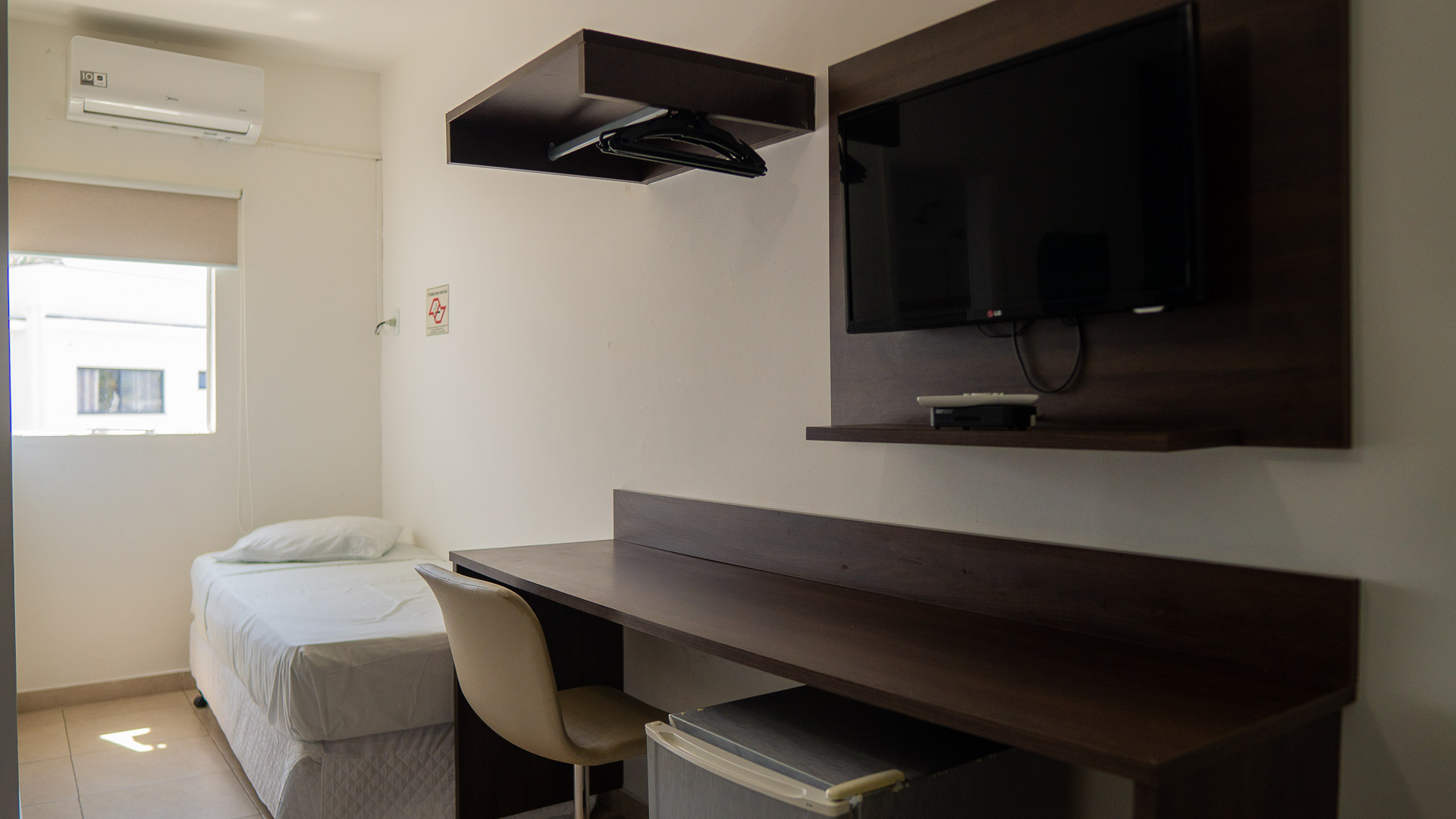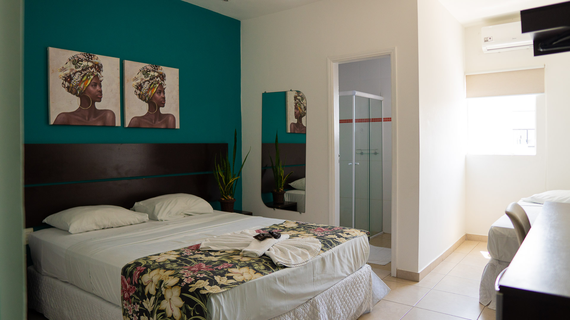 Suíte confortável com ar-condicionado, TV, frigobar e banheiro privativo.