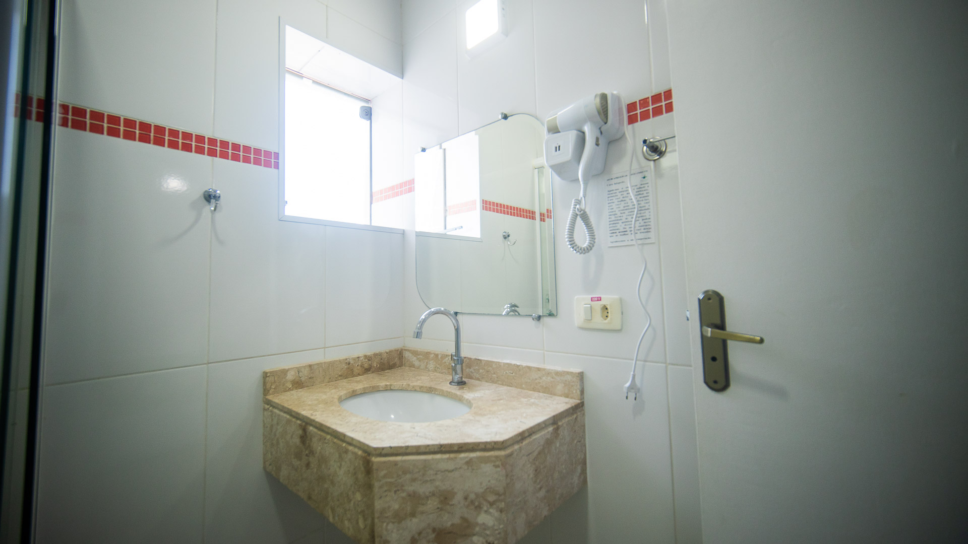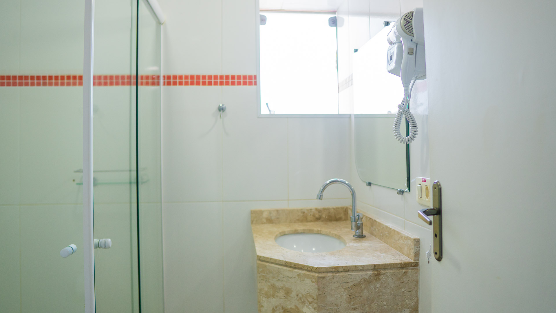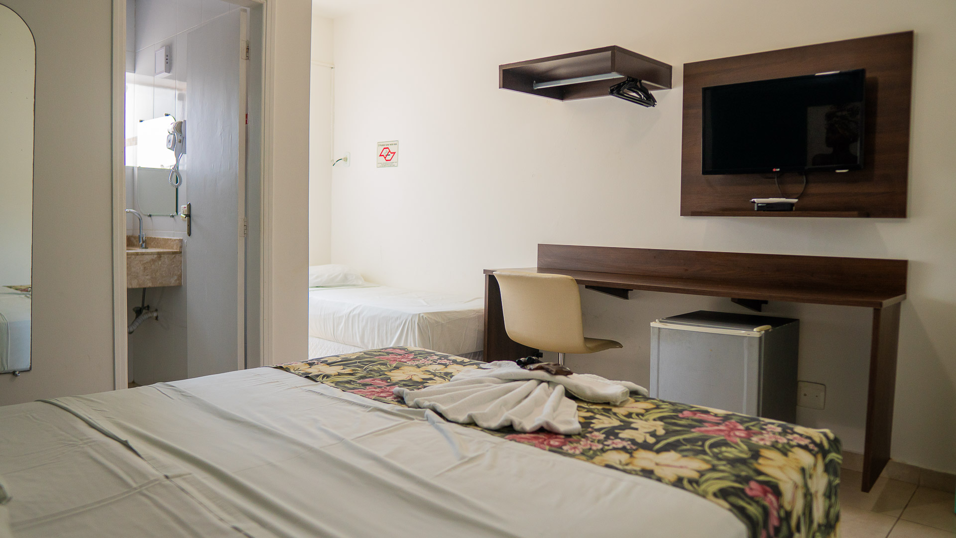 Suíte confortável com ar-condicionado, TV, frigobar e banheiro privativo.
